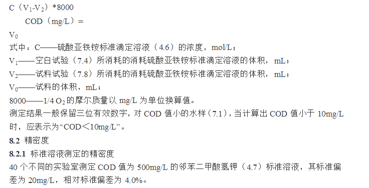 7.1 對于COD值小于50mg/L的水樣,應采用低濃度的重鉻酸鉀標準溶液(4.5.2)氧化,加熱回流以后,采用低濃度的硫酸亞鐵銨標準溶液(4.6.4)回滴。