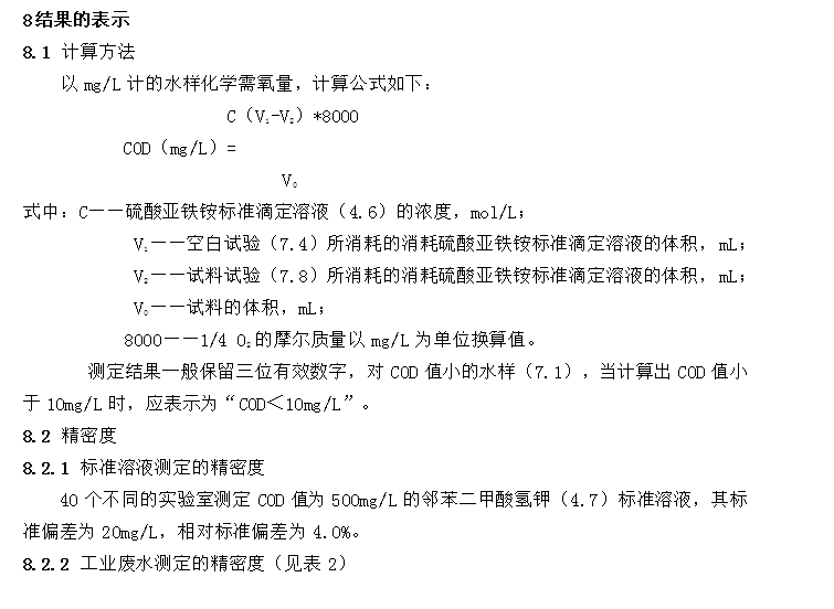 7.1 對(duì)于COD值小于50mg/L的水樣,應(yīng)采用低濃度的重鉻酸鉀標(biāo)準(zhǔn)溶液(4.5.2)氧化,加熱回流以后,采用低濃度的硫酸亞鐵銨標(biāo)準(zhǔn)溶液(4.6.4)回滴。