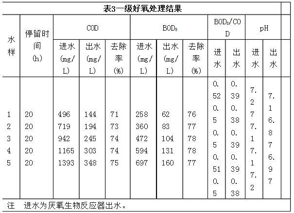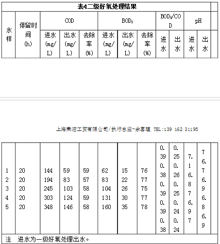 2.2 好氧生物接觸氧化處理 好氧接觸氧化法具有耐沖擊負(fù)荷,無(wú)污泥膨脹和維護(hù)方便等優(yōu)點(diǎn)。采用一級(jí)好氧生物接觸氧化處理,出水中的COD仍然達(dá)不到排放標(biāo)準(zhǔn),后又增加了一級(jí)好氧生物接觸氧化處理(有效容積20 L)。試驗(yàn)結(jié)果見表3和表4。