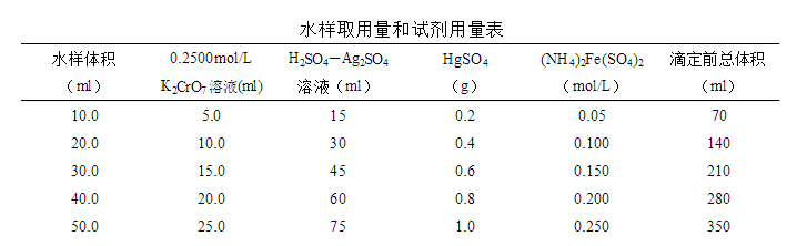 注:①對(duì)于化學(xué)需氧量高的廢水樣,可先取上述操作所需體積1/10的廢水樣和試劑,與15mm×150mm硬質(zhì)玻璃試管中,搖勻,加熱后觀察是否變?yōu)榫G色。如溶液顯綠色,再適當(dāng)減少?gòu)U水取樣量,知道溶液不變綠色為止,從而確定廢水樣分析時(shí)應(yīng)取用的體積。稀釋時(shí),所取廢水樣不得少于5ml,如果化學(xué)需氧量很高,則廢水樣應(yīng)多次逐級(jí)稀釋。