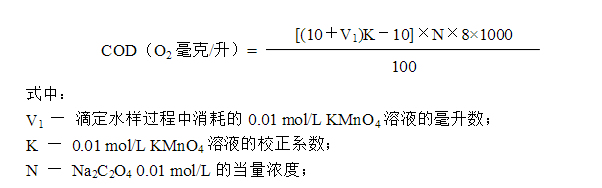 4.6 KMnO4溶液校正系數(shù)的測(cè)定:取步驟4.5滴定完畢的水樣,用滴定管加入10ml(0.01 mol/L)Na2C2O4溶液,再用0.01 mol/L KMnO4溶液回滴**溶液呈微紅色。記錄相當(dāng)于10ml(0.01 mol/L)Na2C2O4溶液的KMnO4溶液的毫升數(shù)V2,則KMnO4溶液的校正系數(shù)K=10/ V2。