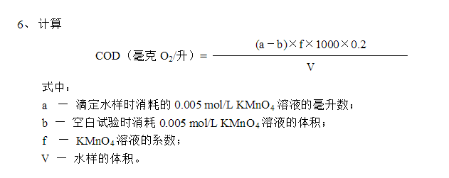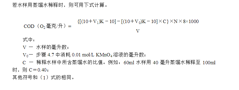 4.7 若水樣用蒸餾水稀釋時(shí),需另取100ml蒸餾水,按步驟4.2~4.5測(cè)定空白值,記錄消耗的0.01 mol/L KMnO4溶液的毫升數(shù)V0。