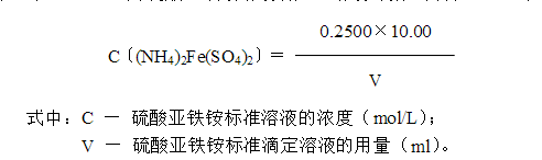 8.7 每次實(shí)驗(yàn)時(shí),應(yīng)對(duì)硫酸亞鐵銨標(biāo)準(zhǔn)滴定溶液進(jìn)行標(biāo)定,室溫較高時(shí)尤其應(yīng)注意其濃度的變化。標(biāo)定方法亦可采用如下操作:于空白試驗(yàn)滴定結(jié)束后的溶液中,準(zhǔn)確加入10.00ml、0.2500mol/L重鉻酸鉀溶液,混勻,然后用硫酸亞鐵銨溶液進(jìn)行標(biāo)定。