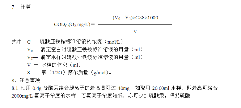 8.3 對(duì)于化學(xué)需氧量小于50mg/L的水樣,應(yīng)改用0.0250mol/L重鉻酸鉀標(biāo)準(zhǔn)溶液。回滴時(shí)用0.01mol/L硫酸亞鐵銨標(biāo)準(zhǔn)溶液。