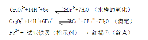 在強酸性溶液中,準確加入過量的重鉻酸鉀標準溶液,加熱回流,將水樣中還原性物質(主要是有機物)氧化,過量的重鉻酸鉀以試亞鐵靈作指示劑,用硫酸亞鐵銨標準溶液回滴,根據所消耗的重鉻酸鉀標準溶液量計算水樣化學需氧量。