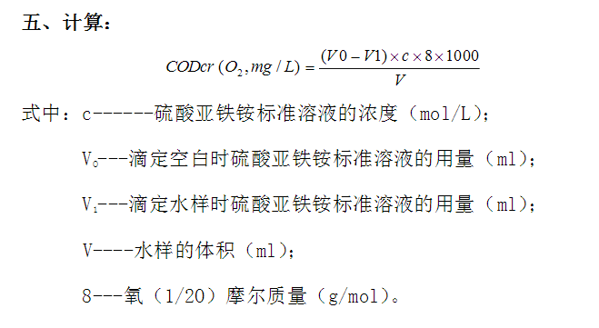 4、 測定水樣的同時,取20.00ml重蒸餾水,按同樣的操作步驟作空白試驗。記錄測定空白時硫酸亞鐵銨標準溶液的用量。 五、計算: