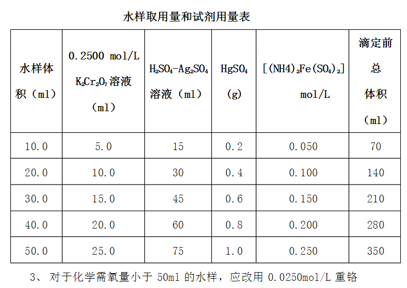 2、 水樣取用體積可在10.00-50.00ml范圍內,但試劑用量及濃度需按下表進行相應調整,也可得到滿意的結果