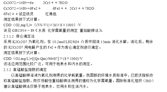 有機污染物種類繁多,結構復雜,化學穩(wěn)定性差,易被水中生物分解。在環(huán)境監(jiān)測中,對有機耗氧污染物,一般是從各個不同側面反映有機物的總量,如COD、OC、BOD、TOD、TOC等,前四種參數(shù)稱為氧參數(shù), TOC稱為碳參數(shù)。對于單一化合物,可以通過化學反應方程進行計算, 以求得其理論需氧量(ThOD)或理論有機碳量(ThOC)。各耗氧參數(shù)在數(shù)值上的關系有:ThOD>TOD>CODcr>OC>BOD5。 2.5.1化學需氧量(COD)的測定