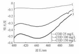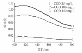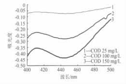 由圖 1 可知,在400~500 nm 波長范圍內,對應于水樣 COD 從 25 mg/L 變到 100 mg/L,重鉻酸鉀氧化所產生的 Cr(Ⅲ)的吸光度變化**大只有 0.06 多