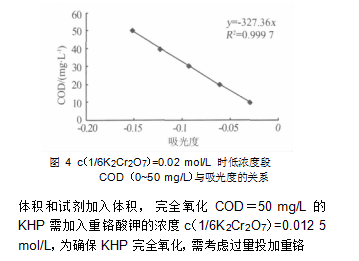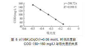 當 重 鉻 酸 鉀 投 加 濃 度 c(1/6K2Cr2O7 )=0.02 mol/L,COD 為 10~50 mg/L 時, 水樣 COD 與吸光度