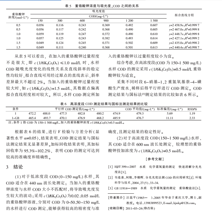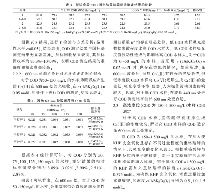 2008 年*家環境保護總局發布了《水質 化學需氧量的測定 快速消解分光光度法》,將 15~1 000 mg/L 的 COD 劃分為 2 個濃度段, 雖然每個濃度段 COD