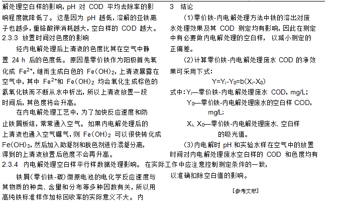 用新鮮的蒸餾水作內電解處理的平行樣(實驗時,空白樣與廢水樣的 pH、所用內電解材料、與水的比例和曝氣方式等工藝條件均相同),測定出廢水水樣 COD 與內電解處理的空白樣 COD 之差作為內電解對廢水的凈處理結果。 采用 CTL-2 型化學需氧量速測儀分別測定內電解前后水樣(取自圖 1 所示取樣點)的 COD。