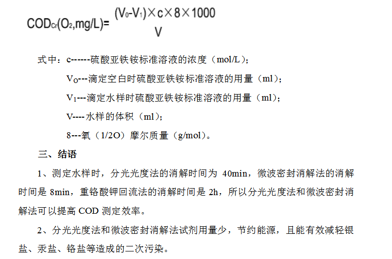 微波密封快速法和重鉻酸鉀回流法一樣,采用硫酸—重鉻酸鉀消解體系,在硫酸銀催化下,采用2450MHz的電磁波(微波)來加熱反應(yīng)液,采用密封消解方式使消解罐內(nèi)部壓強(qiáng)迅速提高到203kPa,在高溫高壓下達(dá)到快速消解的目的。消解后過量的重鉻酸鉀用硫酸亞鐵銨標(biāo)準(zhǔn)溶液回滴,以試亞鐵靈為指示劑,根據(jù)硫酸亞鐵銨的消耗量計算出COD值。